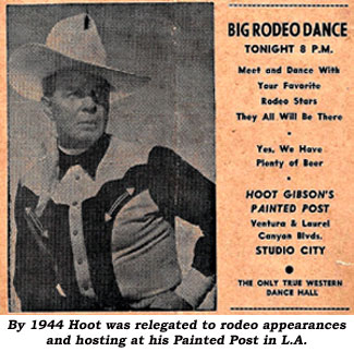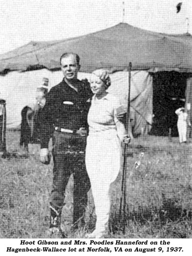 Prior to entering the movies in 1910 Hoot Gibson was an accomplished rodeo performer. He was with Dick Stanley’s Congress of Rough Riders and Bud Atkinson’s Circus and Wild West. Tex McLeod, World Champion Fancy Roper from 1912 through 1916, who played small parts in dozens of silent Westerns, stated, “I toured with Hoot Gibson in 1912 with the Bud Atkinson Circus and Wild West Show. Hoot was the best I knew.” Hoot was featured with Wallace Bros. Circus early in 1937 then joined Hagenbeck-Wallace for the rest of the season. In 1938 he was with Robbins Bros. and in ‘39 he went with Russell Bros. Circus. In 1940 he organized the Hoot Gibson Rodeo and Thrill Circus which didn’t last long.