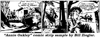 Stylized art work was by Bill Ziegler (1925-1993) who also drew issues of REX ALLEN, DALE EVANS, RANGE RIDER, JOHNNY MACK BROWN, BILL ELLIOTT and ANDY BURNETT for Dell. Over the years he also found work at Fawcett, Hillman, Fiction House and was active at Charlton in the ‘50s. From April ‘51 to early ‘53 Ziegler drew the short-lived ANNIE OAKLEY daily comic strip for Mirror Enterprises.