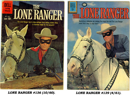 Tom Gill (1913-2005), a solid artist, drew most of the stories from #38-145, although there was occasional work by Jim Christiansen (‘27- ) and Herb Trimpe (‘39- ). The most desirable issues to collectors began with #112 (10/57) when Dell made the switch from art covers to fabulous action oriented photo covers featuring Clayton Moore—a few even adding Silver to the mix (#112, #123, #124, #126, #127, #136, #138, #139, #141, #144). The photo covers lasted til the end came with #145. Originally monthly, with #124 the comic switched to bi-monthly in Oct./Nov. ‘58, with the last issue being, as noted, a quarterly, but obviously Dell decided sales were not strong enough to keep the comic going. In Fine #112-145 range from $50 to $30@, except for #118—a special origin Silver Anniversary issue—at $66.