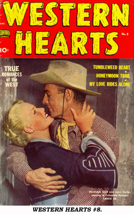 Randy’s final photo cover appearance was for Standard Comics’ WESTERN HEARTS #8 (Sept. ‘51) in a romantic embrace with Janis Carter from “Santa Fe”. Standard also used Western film photos of Whip Wilson and Reno Browne, Jerome Courtland, Rex Allen, Ray Milland and Hedy Lamarr, Fred MacMurray, Jock Mahoney and Bill Williams and Jane Nigh on their covers to spur on sales. After 9 issues the title was cancelled in March ‘52. Look for Fine copies at $40.