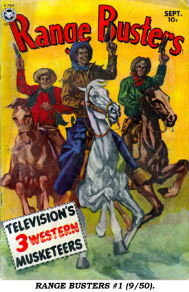 RANGE BUSTERSAs you know, The Range Busters were a very successful B-Western screen trio from 1940-1943 at Monogram. There were 16 films with Ray “Crash” Corrigan, John King and Max Terhune. Corrigan stepped out for four replaced by Dave Sharpe. When Corrigan returned, King was gone replaced by Dennis Moore. Nothing more was heard from the trio until Fox Feature Publications released one issue of RANGE BUSTERS, calling them “Television’s Three Western Musketeers” on a cover blurb. But these three, the leader Scotty, young Chip and heavy-set sidekick Doodle bore no resemblance to Monogram’s threesome. Perhaps a TV pilot was filmed, but if so it has never surfaced.