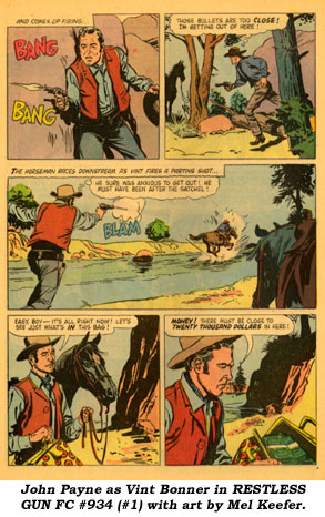 “RESTLESS GUN”John Payne as Vint Bonner on “Restless Gun” began on NBC September 23, 1957 (spun off from James Stewart as Britt Ponset on NBC Radio’s “The Six Shooter” which ran from September ‘53 to June ‘54). Dell began a sporadic five issue series based on “Restless Gun” with Four Color #934 (#1) in September ‘58, a full year after the TV series debuted. Mel Keefer (1926- ) provided the art for this issue, obviously using a lot of John Payne photo reference. Keefer even incorporated a Ted DeCorsia likeness onto the badguy in the first story. Keefer also worked on ZORRO, SWAMP FOX and TALES OF THE TEXAS RANGERS at Dell and ghosted the GENE AUTRY comic strip in ‘54-‘55.