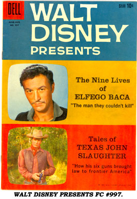 WALT DISNEY PRESENTS began with FC #997 (June-Aug. ‘59) and featured “Texas John Slaughter” and “Elfego Baca”, both of which had begun on TV the previous October. There were front and back cover photos of Tom Tryon (Slaughter) and Robert Loggia (Baca). An added bonus were the words to both series TV theme songs on the inside back cover.