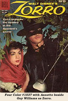 Looking at current prices for just the Disney/Guy Williams photo cover issues, FC #882 commands $39 in Fine. FC #920 through #1003 are $30 in Fine. FC #1037 which has Annette alongside Williams brings $36 (left). #8-12 can all be found for about $21 each. Gold Key #1 lists for $21 with #2-9 at $12. In 1990 Marvel issued #1-12 based on a later “Zorro” TV show. In 1993-1994 Topps had 11 Zorro issues not related to TV. Dynamite Ent. currently holds the rights to the character.