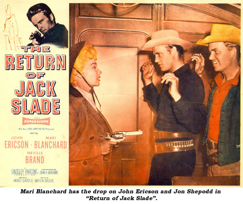 MARI BLANCHARDVoluptuous, exotic-looking Mari (pronounced Mar′-e) Blanchard was possessed of a striking but synthetic beauty, relegating her to being cast as tarts, home wreckers, and other assorted femme fatales. Born Mary Blanchard April 13, 1923, in Long Beach, CA, she contracted a crippling case of polio at age nine but fought back and was walking again by 11. She swam daily for several years to restore her muscles and even ran away at 17 to join Cole Brothers Circus where she rode elephants and performed on the trapeze. After attending Santa Barbara State College, UCLA and USC to study international law, she went to New York to seek employment in the international trade business but wound up signing with the Conover Model Agency. In ‘48 she was cartoonist Al Capp’s inspiration for Stupefyin’ Jones in his “L’il Abner” strip. Capp later sent Mari on a nationwide publicity tour to promote Sadie Hawkins Day. A Kodak bubble bath advertisement brought her to the attention of Paramount in late ‘49 but she only remained under contract until late ‘51. “I couldn’t have been lower when Paramount let me go,” she is quoted. “I am grateful to the studio for training me, but every role that came up was either too big or too small for me to do. I’d have gone back to New York and modeling if it hadn’t been for my agent. He wouldn’t let me get discouraged. I figure that a girl has until 35 to use her face and figure. I wanted to use up those years left to me constructively.” Freelancing, the 5' 5" actress made her first Western as the saloon singer mistress of badman Hugh Beaumont in Tim Holt’s “Overland Telegraph” (‘51 RKO). Universal-International saw her potential with her first two there being “(Willie and Joe) Back at the Front” (‘52) and “Abbott and Costello Go to Mars” (‘53). Three Westerns quickly followed.