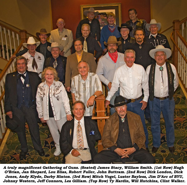 Aye dogies, if we didn’t have the snazziest farewell banquet I ever did see. Ray Nielsen and Boyd handed us each an award, a beautiful inscribed heavy glass object d’art in an elegant gift box. Jan Shepard told us how she met Elvis, cute. Her slacks matched his jacket. Elvis said, “I’ll give you my coat, if you’ll give me your pants.” Her hubby Dirk London stirred us with his eloquent delivery of the poem “Cowboy Up!” Mitch Vogel touched Bab’s heart with his sincere acceptance speech. Jennings Barnett was Red Skelton. John Buttram was Pat Buttram. Lou Elias and I reminisced about working on Wild Bill Wellman’s “Lafayette Escadrille”. Hugh O’Brian and I reminisced about working on “Mr. Roberts” with Vince Gardenia in summer tent theatres in ‘63. Hugh recalled our biggest laff. One of our cast members made a spectacular entrance. The goat peed on stage! Hugh praised Bab’s cowgal outfit. She was all a-twitter. She kissed his hand and shook his lips. Johnny Western and Les Gilliam strummed and sang medleys of cowboy songs. Babs used to pick-out all her favorite TV Western themes on the piano with one finger. Then she took lessons and picked ‘em out with two fingers. All except the “Sugarfoot” theme. That only got a finger. Bill Smith gave us a signed copy of his book of poetry. Included are Muscle Beach pics of Bill. James Stacy and Bob Fuller drew Hi-Decibel squeals from a horde of Lancer Ladies and Laramie Lassies. My International Fan Club, The Sweet Toes Sweeties, will hold their annual meeting in September at Penn Station in a phone booth. Anthony W. Joynt bid three G’s on a Gibson gitfiddle, and won. A swooning Lancer Lady forked out $285 for a kiss from James Stacy. She got her money’s worth! I got two eighty for a hearty handclasp. Two dollars and eighty cents. The bar was dark, but the Lancer Ladies lit it up with a wingding. Jeff Connors quietly crooned soulful songs. Hugh O’Brian got a gaggle o’gals gigglin’ with close-up magic. Babs told a couple of Aussie women that I worked for three years in Australia to watch my career go down the toilet, counter-clockwise. We were all in high spirits. Or were we high on spirits? I posed for a pic with a pert miss. She patted my cheek. My right cheek. My lower right cheek. These good people sure made it tough to say adios. On a scale of 1 to 10, Babs and I rate “A Gathering of Guns 2” ELEVEN! Some of the wives formed a group. I suggested “WOWS” —Wives of Western Stars! Babs said, “Almost. We’re WOOWS —Wives of Old Western Stars!” —Hmmmm...Adios Y’all |