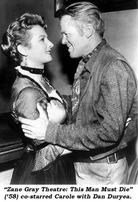 Carole recalls on “Treasure of Ruby Hills” (‘55), “Zachary Scott was really nice. We were just friends, but we used to go out to dinner. He was married at the time to Ruth Ford, I believe.” Another of Carole’s Westerns was “Showdown at Boot Hill” (‘58) with Charles Bronson. “That was funny, because Charles Bronson, when I was doing that, said he was a method actor. He came out of New York. He came up to me, very nicely, ‘I don’t want to throw you, but I never do Like most actresses, Carole moved into the burgeoning new world of television in the early ‘50s. “I rode an elephant on ‘The Cisco Kid’ in 1952.” In the early days of live television, Carole says, “Most of the movie actors were scared of TV because it was like live theatre. But I took to live theatre like a duck to water and really enjoyed live television.” She worked on “G. E. Theatre”, “Playhouse 90”, “Kraft Theatre” and others.