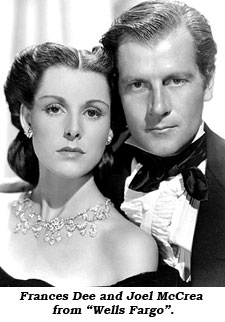 Asked about a John Wayne story, the star (who appears with the “Duke” in ‘41’s “A Man Betrayed” aka “Wheel of Fortune”) remembers, “There’s a scene where we are at a nightclub and a big fight breaks out. John is supposed to put a tablecloth over me and carry me out. We thought it’d be fun if I did it—not a stunt double. I didn’t think about it until we were actually doing it, but I was getting hit while he was carrying me! When the tablecloth was removed and the director saw I was under it, he was not at all pleased! (Laughs).” Remembering Joel McCrea’s “This is Your Life” induction into the Cowboy Hall of Fame, Frances smiles, “That was the highlight of his mature years. He was on the board for a long time, and president for two years. We’d go to Oklahoma twice a year for various duties. There was a wonderful artist who did his portrait. Joel preferred Westerns,” Frances said, “He always wanted to do them. He’d say, ‘If I have to do claptrap, I want to do it on a horse!’ In fact, his two favorite pictures are ‘Ride the High Country’ and ‘Stars in My Crown’. Whenever Joel was in a Western, Jody would visit the set. He usually shows up as an extra. So, he’s probably in ‘Four Faces West’.” Joel McCrea used a few horses over and over. “Yes, he had this big old horse, Diamond Jr.—he rode him a lot in pictures. I bought Diamond Jr. as a present. And Dollar—the favorite horse—he had a dollar sign on his hip—was in ‘Four Faces West,’ among many others. Joel rode as a kid in Hollywood—in the canyons between Hollywood and the Valley. He and a friend would camp out. It was then, at age 16 or 17, he did a lot of wrangling and extra work, for pictures shooting near his house.” About her children, Frances relates, “David moved to New Mexico then Jody eventually settled there. This area is too grown up for ranching. The brothers live 30 miles from each other, near Roswell. Jody has lots of dogs. After several of those beach pictures, which he found to be ‘getting pretty silly,’ Jody quit and went into ranching. Both borrowed the money to get started. Ranching, despite the Hollywood look at it, is long days and hard work with sometimes little or no profit—sort of like farming! Peter lives in Connecticut. Joel quit films after ‘Ride the High Country’. The Hays Office was gone and scripts were getting worse and worse. There would be new scripts coming in but Joel said he couldn’t do that stuff. He did do ‘Mustang Country’, a good clean picture, shot in Canada. He loved the story. He liked the director, and John Wayne’s son, Patrick, was in it. It was not a moneymaker, however.” Joel McCrea didn’t change over the years, Frances laughs, “He just got more mellow. Women, however, get to be rascals (Laughs).” The cowboys he liked? “John Wayne was first; then Gary Cooper—a friend since the ‘30s; James Stewart and Randolph Scott, of course.” Other than ranching and acting, Frances says Joel always claimed, “‘If I hadn’t been a rancher, I’d have been a beach bum.’ He loved body surfing—we went to Ventura, sometimes rented a beach house; and let the kids learn to surf. Typical Californians!” Joel McCrea was considered the best horseman in Hollywood, and he knew it. “That’s because he was told it so often! He could do anything; he kept everything in tip-top shape.” Frances’ Western Filmography Movies: Caught (‘31 Paramount)—Richard Arlen; Wells Fargo (‘37 Paramount)—Joel McCrea; Four Faces West (‘48 U.A.)—Joel McCrea; Gypsy Colt (‘54 MGM)—Ward Bond. |