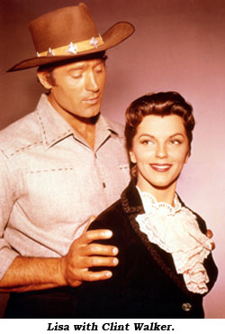 Lisa with Clint Walker.We asked Lisa who she felt best portrayed a cowboy. “Clint Walker! I did two ‘Cheyenne’s with him, and I did his screen test when he was signed at Universal. He was Chet back then, but he didn’t stay long. He is big, slow speaking and easy going—he settled into the saddle better than anybody else. Clint was always after me to quit smoking (Laughs), but he failed. I have since quit myself. Incidentally, Clint Eastwood was another Universal alumni. I did his reading at Universal as well. His hair stood up like five fingers—a cowlick. He is a sweet guy to work with. I did do ‘Zorro’ with Guy Williams, but he was going out as I was going in (to Universal); I never knew him too well. Jack Kelly and I did a ‘Maverick’. We were both at Universal where, at one time, he had his leg in a cast and had to walk with a cane and I had a back brace. On Tuesday or Wednesday, the studio would show us classic movies and we’d have to break them down; critique them. Jack and I showed up with our casts! (Laughs) Jack broke his leg on a movie set. As for me, I was going to show Teala’s daughter what fun it is to do a backwards slide, down a slide! (Laughs) I went ‘Whoopee’ and slid onto the cement of a badminton court! I hit and cracked the lumbar of my back. The doctor said I could either be in a body cast for six months, or a brace for one year. I took the brace, even though it required daily heat and other treatments, because I would still be mobile. This was right after I signed with Universal. I was going to class, so it didn’t matter as much. Right after I got out of the brace, I did the picture with Audie—and still had muscle spasms because I had been in that brace for so long. The brace went from the back of the neck to the tailbone; it was rigid, but I could walk.”
