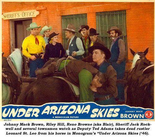 Johnny Mack Brown, Riley Hill, Reno Browne (aka Blair), Sheriff Jack Rockwell and several townsmen watch as Deputy Ted Adams takes dead rustler Leonard St. Leo from his horse in Monogram's "Under Arizona Skies" ('46).