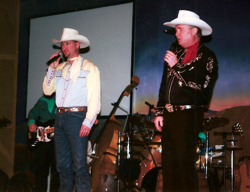 Dusty Rogers (R) and his son Dustin performing at the Happy Trails Theatre in the Roy Rogers Museum in early December 2009.