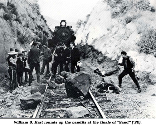 The first William S. Hart western produced by his own company, after freeing himself from the production reins of Thomas H. Ince…and it’s a good one. “I want my next two years in pictures to be free from worry about business,” Hart stated, “so I can devote my time to making good photo-dramas.” Directed, as other Hart westerns had been, by Lambert Hillyer, “Sand” was basically a railroad story filmed in late 1919 on the desert outside Victorville, CA. Hart’s favorite horse, the pinto Fritz, had been out of Bill’s films for a couple of years and “Sand” was his return, with advertisements making the most of the pinto’s return. Fritz, named Boss in the picture, is expertly incorporated into the storyline. * * “Sand” opens with Hart on his way to replace elderly Hugh Jackson as railroad station agent in the town of Condor. On the way, Hart is made aware of bandits who recently robbed the train of $20,000 and got clean away. Arriving in Condor, Hart finds the man he is to replace is the father of a girl he fell in love with sometime back, Mary Thurman. At first he declines the job, but Mary explains she and her Pop are going to work in the general store of G. Raymond Nye who is also the primary stockholder in the railroad as well as having his eyes set on Mary. The duplicitous Nye eventually manages to have Hart fired, but Bill immediately gets a job on a nearby ranch with old pal Bill Patton. At the same time Hart learns he is getting his old pinto horse, Boss (Fritz), back again. Mary overhears a conversation between Hart and Patton and believes Bill is in love with another woman. Hurt, she at first agrees to marry Nye. Hart, crushed, fades away to work on the ranch and tries to track down the elusive train bandits. Realizing she doesn’t love Nye, Mary decides to leave Condor on the train. In the desert, Hart comes upon the train bandits—led by Nye—attempting to hold up the very train carrying Mary.