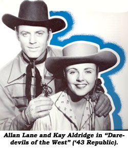 The beautiful and gracious star of three of Republic’s absolute best cliffhangers, Kay Aldridge, 77, succumbed to a heart attack on January 12, 1995, in Camden, ME. At the time, “Perils of Nyoka” director Bill Witney told us, “Kay was a sweet, pretty and thoughtful person. She never met a stranger in her life and the crew loved her. One couldn’t help but like Kay. She bore the bumps, bruises, skinned knees and elbows that go with being a serial leading lady without a complaint. She stuck around the set looking over my shoulder long after she was dismissed for the day. She was one helluva gal. I’m sure there is a place in heaven for a beautiful, gutsy, fun loving, caring person like Kay.”