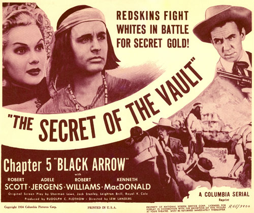 “Martin Garralaga was a cute guy. He taught me a lot of naughty Mexican words. I got in trouble with the Indians by using them. (Chuckles) Interesting thing was, one of the scenes where I had to run a race, to determine who would be the next chief. As I was running, in the group of people playing Indians, Jim Thorpe was there. Jim came up to me and said, ‘When you’re running, you’re pointing your feet out as you run, just a little, about an inch or two, so you’re going extra distance. When you run, make sure you keep your feet straight, you’ll get there faster.’ He was very sweet about giving me advice. I was very grateful. But it was sad, in a way, because he was one of the great American athletes of all time.” BM: It always seemed to me Adele Jergens was a little miscast in “Black Arrow”. RS: “Well, a little. I was very fond of Adele. She was a good sport. She was really a showgirl, a nice actress, not a traditional Miss America, but I really enjoyed her. She became a very good friend.” BM: Remember anything about Kenneth McDonald? RS: “Kenny? Yeah. Later, I’d do a ‘Perry Mason’ about every year, I did about 13 of them. Kenny played a judge over there and that’s the last time I saw him. He was just as good as he was in ‘Black Arrow’. A good actor, a journeyman actor, but a solid one. Then there was Bob Williams. I said, ‘Listen, when are they going to put you in the statue holding the torch up for Columbia? (Chuckles) God, he was in more pictures!”