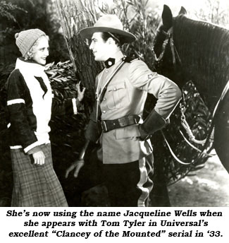 She's now using the name Jacqueline Wells when she appears with Tom Tyler in Universal's excellent "Clancey of the Mounted" serial in '33.She recalls Tom Tyler, her co-star in “Clancy of the Mounted”, as “…so handsome, so tall, and his voice—striking. But he was a man and I was a child playing a grown-up, so naturally we never dated or anything like that. I thought the serial was marvelous, incidentally.”