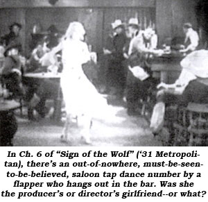 In Ch. 6 of "Sign of the Wolf" ('31 Metropolitan), there's an out-of-nowhere, must-be-seen-to-be-believed, saloon tap dance number by a flappre who hangs out in the bar. Was she the producer's or director's girlfriend--or what? Theoretically there’s no reason why a comedy or musical serial couldn’t be made. Among feature films there have been any number of mystery-suspense comedies: think “Mark of the Vampire”, “The Gorilla”, or Harold Lloyd. It’s not beyond the imagination to picture an appealing comic hero as the star of a serial. It’s too bad no one tried.