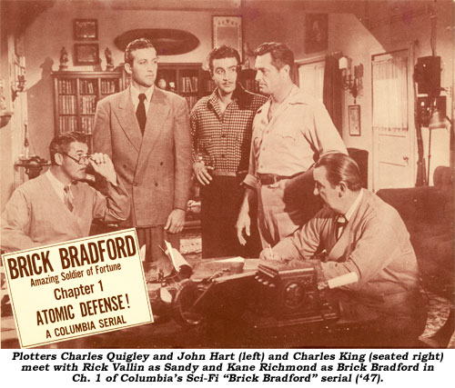 Plotters Charles Quigley and John Hart (left) and Charles King (seated right) meet with Rick Vallin as Sandy and Kane Richmond as Brick Bradford in Ch. 1 of Columbia's Sci-fi "Brick Bradford" serial ('47).