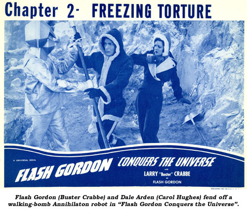 The third Flash Gordon Universal serial ,“Flash Gordon Conquers the Universe” ('40), featured radio-controlled Annihilaton robots which Flash and Dale Arden (Carol Hughes) encountered in a mine in Frigia. These weird looking Annihilatons were electronically charged walking bombs. Their eerie jerky motion was achieved by the trick of undercranking the camera speed.