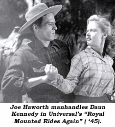 Tom and Jim Goldrup interviewed Joe Haworth. In 1944 Joe appeared in his first Western and first serial, “Raiders of Ghost City”, at Universal. This was the first of three serials, the other two being “The Royal Mounted Rides Again” and “The Mysterious Mr. M”. When Joe first saw a script for the serial that looked as thick as a telephone book, he exclaimed, “What are you talking about?” When talking about Dennis Moore, his co-star, from the last named serial, Joe said, Denny Moore was a very good athlete—you had to be. But he forgot his dialogue all of the time. We did all 13 chapters at one time and that’s where we got mixed up. Sometimes it got pretty confusing and you didn’t even know what chapter you were in.” Joe illustrated this point by explaining, for instance, in “The Royal Mounted Rides Again” where he would Joe told of another bad experience with a horse, but this time it was because the horse was just plain crazy. On the first day of filming “The Royal Mounted Rides Again”, actor Jack Randall was killed in an accident, and Joe was called to replace him in the role of Bunker, the chief henchman for Milburn Stone. Commenting on this incident Joe told us, “On about the third scene Randall was in he was told to leap on this horse and fly through the forest as fast as he could go, but a branch of a tree hit him in the head and killed him. I was on the backlot shooting a picture and somebody came up and said, ‘Joe, they want you up front. You got to go and get wardrobe.’ I said, ‘I got wardrobe,’ and they said, ‘No, this is for another movie.’” The next day they told Joe to put on the wardrobe. “Whose is it?” Gene Coffin, the wardrobe man, answered that it was Jack Randall’s. “I’m a little superstitious,” Joe confided, and even though there would be five weeks work I refused at first, but they talked me into it.” Joe was told they just wanted him to do a run-through of riding so they went to the woods to shoot the scene. Joe was directed to stay a certain distance ahead of the camera car that was following, with added instructions that every once in a while to pull up and go back a little. “I got up on the horse, a beautiful horse named Phantom or Phantom Valley,” Joe stated, “but the minute it saw the camera car he just took off like a bullet and we went right past it and through all the woods. Joe was then told to do the run again. Joe, remembering Randall had been killed riding that horse at the same spot, stated he couldn’t handle the horse and didn’t want to get on it again. “Come on now, you’ve done it once. We’ve shot for two days so you have to do it. We can’t lose two more days.” So Joe got on the horse to do another run-through and it took off like a bullet and went right through the whole scene through the forest. Joe exclaimed, “I don’t want to get on that horse again, It’s crazy!” “No, it’s not crazy,” was the response, “it’s just excited from having that accident. Just get on and do a take.” “All right,” Joe said, “I’ll try it once more and see if I can stop him.” “So I tried it again,” Joe told us, “and the horse tried to run away with me. I thought I was going to be killed, but they got the take.” The next day Joe was asked to do another scene on Joe was on another picture and so was the same horse, and when he was told that was the horse he was to ride, he replied, “No, I’m not.” They got a different actor to do it and the horse ran away with him too. Joe asked them later, “What was the matter with that damn horse? I couldn’t stop him.” They answered, “Nobody could stop him. The minute he got his head he was gone. Even the wranglers couldn’t stop him.” Steve Mitchell was one of the stars in the Republic serial “Jungle Drums of Africa” and said of his experience, “It’s like doing summer stock in an iron lung. You have no time; you learn the lines and get out there and do it. A lot of the time you do your own fighting so you would wind up in those days fighting with the greatest guy in the world, Davey Sharpe.” Steve mentioned that in case you forget something Davey would say to just keep throwing punches and he would ad-lib right along with you. “Don’t worry about hitting me; I’m fast,” Sharpe would say, and Steve would reply, “I’m not worried about that, I’m worried about you hitting me. It’s a lot of fun on the serials, but the name of the game is to do the job and get it done,” he added.