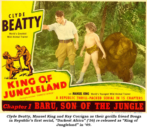 Clyde returned to the screen in 1936 for “Darkest Africa”—Republic’s first serial—an outgrowth of a merger between independents Mascot, Monogram and Liberty. Former Mascot president Nat Levine was installed as production head and once again engaged Beatty in order to employ some stock footage from “The Lost Jungle”. 12 year old Baru (Manuel King) seeks help from Beatty to rescue Baru’s sister Valerie (Elaine Shepard) who is being held prisoner as a goddess in the lost city of Joba located in the heart of Africa and patrolled by winged Bat Men.