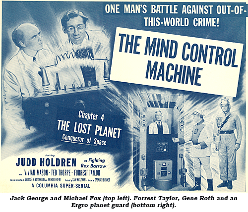 Michael Fox was Dr. Ernst Grood, the electronics genius who plots to conquer the world in collusion with Reckov (Gene Roth) evil ruler of planet Ergro in “The Lost Planet”. Fox told me, “In ‘The Lost Planet’ I played the evil Dr. Grood and I was in my mountain laboratory, looking into a periscope, and I had a line: ‘It worked! The atom propulse set up a radiation wall which cut off the neutron detonator impulse!’ Now that’s a tongue-twister. So we rehearsed it once, as you always did with Spencer (Laughs), then I went for a take. I dashed over to the periscope and I looked into it, and one of the prop men had lowered into the periscope a slide, a crotch shot—a young lady with no clothing on and her legs spread. I looked—but I didn’t break up! And I said, ‘It worked! The atom propulse set up a radiation wall which cut off the neutron detonator impulse!’ I turned (congratulating myself mentally), and I had forgotten Jack George, who played my assistant, had a line; his line was, ‘For every weapon, there is a counter-weapon.’ And when he said that I went right through the roof! (Laughs) I just broke up, and it took me nine takes before I could get the damned line out again! Frankly, in ‘The Lost Planet’, the only decent part was the heavy, my character, Dr. Grood. I could eat the scenery to my heart’s content! Generally in a serial, the writing for the hero is not very outstanding. Each of the 15 episodes was 30 reels of cut film, the equivalent of roughly four normal movies. We shot those in 17 days. Actors worked hard in those days. My call used to be 6am and I worked till 6pm. We didn’t have Saturday off till the late ‘50s, so we worked 72 hours a week. The serial was directed by Spencer Gordon Bennet, who had absolutely no sense of humor but was a wonderful chap and a very good action director. Spencer was then in his sixties and used to always come out wearing a short-sleeved silk polo shirt and a light gray turned-down-brim Stetson hat, with a thin band.”