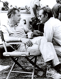 Charlton Heston (right) talks with director Sam Peckinpah while filming