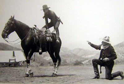 William S. Hart coaches Johnny Mack Brown on how to do a crouper mount during the filming of “Billy the Kid” (‘30 MGM).