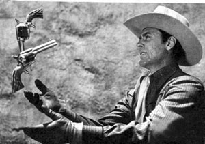 Republic’s B-western star Allan “Rocky” Lane practices his gun tricks in this August 1947 publicity photo.