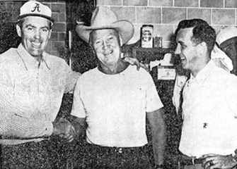 Allan "Rocky" Lane paid Alabama head coach Harold "Red" Drew a visit at a practice game as the Crimson Tide prepared for Tennessee. Johnny Dee, former Notre Dame athlete and Bama's basketball coach is on the right.