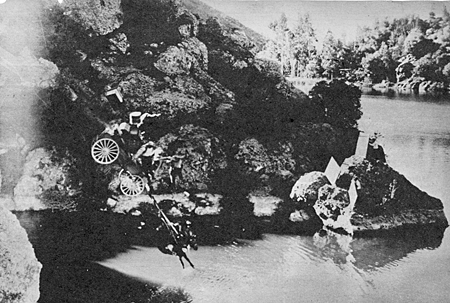 Yakima Canutt, three other stuntmen and two live horses take a 20 foot plunge.