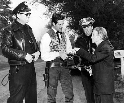 When neighbors became alarmed over the above gunfire, police were called. Here officers Melbie and Henkin observe as Al Jennings shows Hugh O’Brian how Colts were handled in the old days.