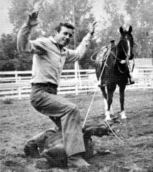 When not playing “Wild Bill Hickok”, Guy Madison likes to keep in shape by roping calves.