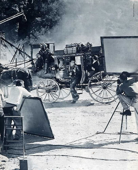 John Wayne, Claire Trevor and others during the filming of “Stagecoach”. (Thanx to Bobby Copeland.)