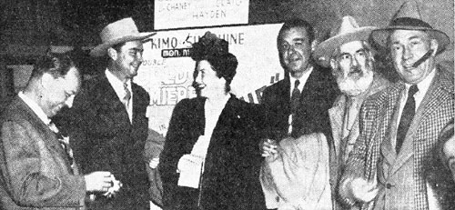 At the world premiere of “Albuquerque” left to right are Bill Thomas, studio executive of Pine-Thomas Studios who produced the western for Paramount release; film co-stars Russell Hayden, Catherine Craig, Lon Chaney Jr., Gabby Hayes; and actor William Demarest who was not in the film but appeared at the premiere.