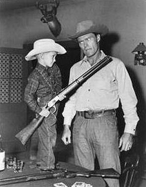 Fraser Heston, Charlton Heston’s son, gets the drop on “The Rifleman” with Chuck Connors’ own Winchester.