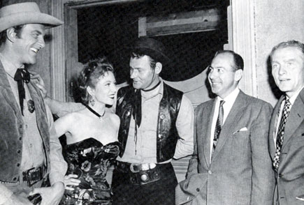 On the set for “Gunsmoke: Hack Prine”, the first episode filmed, are (L-R) James Arness, Amanda Blake, Leo Gordon, Harry Ackerman (VP in charge of CBS West Coast progamming) and Hal Hudson (CBS program advisor).