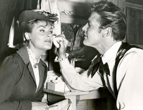 Roger Moore helps to touch up Kathleen Crowley’s make-up as they prepare for a scene on “Maverick: A Bullet for the Teacher”.